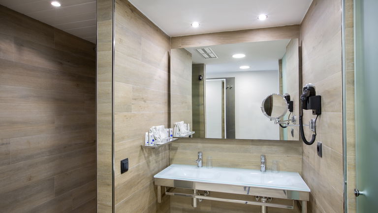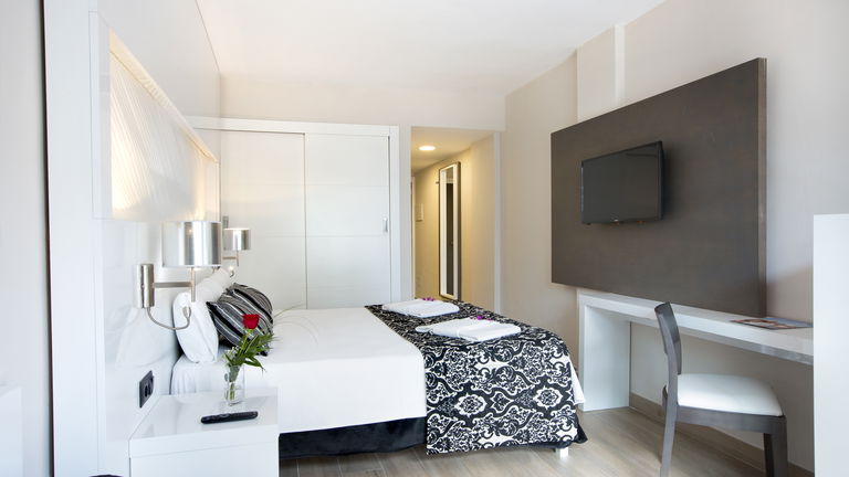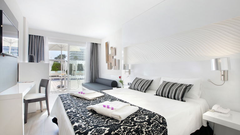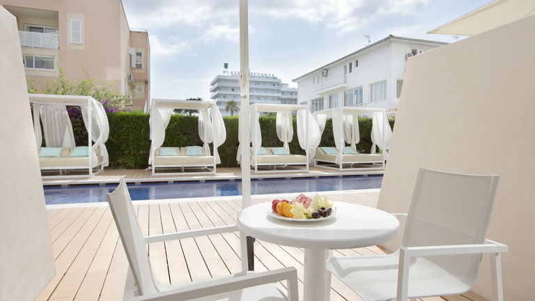 With a ground floor terrace with direct access to the adults only pool, the Junior Suite Swim Up measures 24 m2 and features a double bed, sofa bed, flat screen satellite TV, full bathroom and terrace with small table, chairs, sun loungers and parasol.