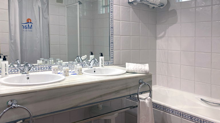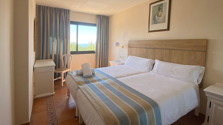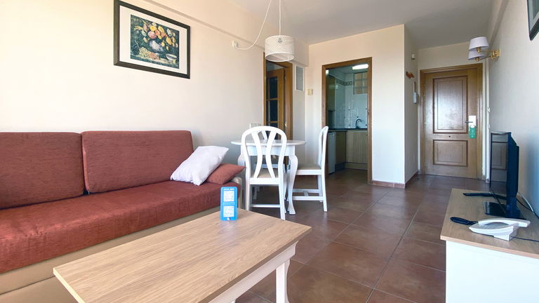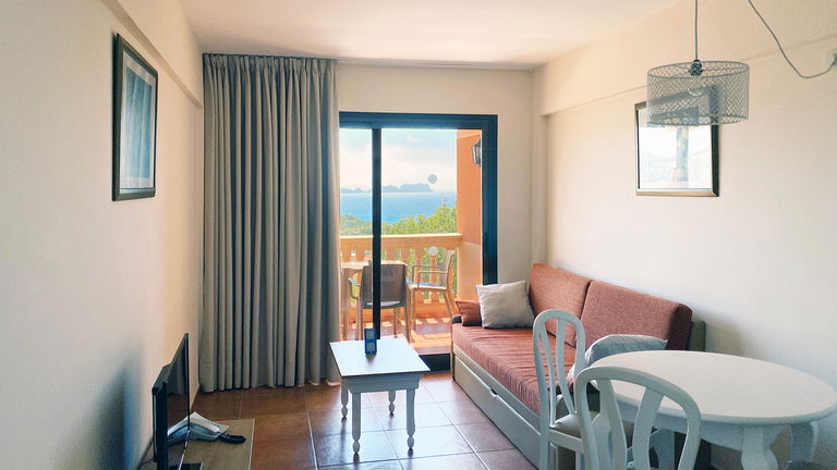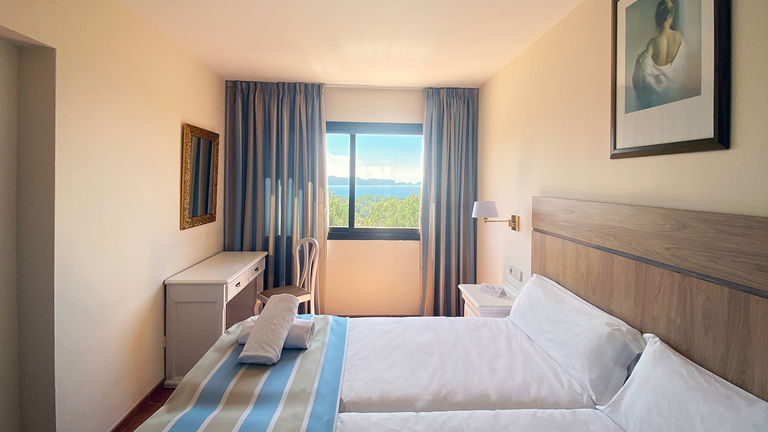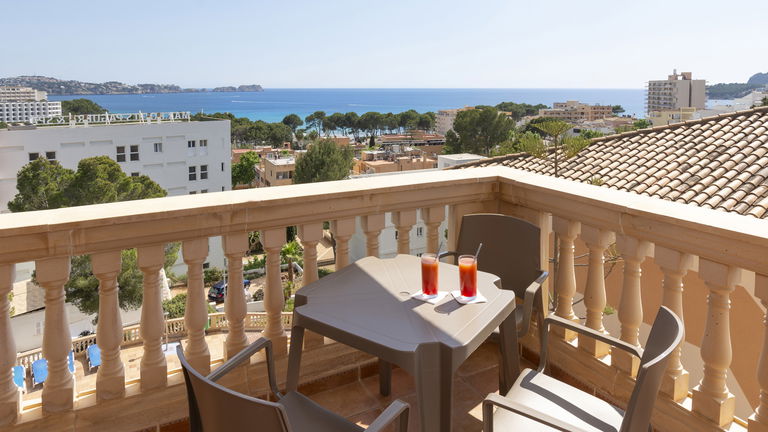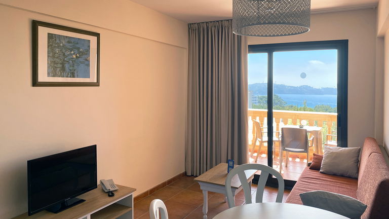 Situados en las plantas superiores de Mar Hotels Paguera Apartments, los apartamentos con vistas al mar tienen una superficie de 37 m2 y disponen de dormitorio con dos camas individuales; salón comedor con sofá cama doble, mesa con sillas y televisor; cocina equipada con pequeña nevera, fogones eléctricos, microondas y vajilla; baño privado, con bañera y ducha independiente, secador de pelo y espejo de aumento, y una terraza de 6 m2, equipada con sillas y mesa, con espectaculares vistas al Mar Mediterráneo.