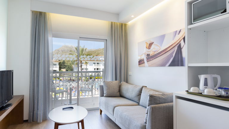 Con 32 m2, las Suites vista piscina disponen de dormitorio independiente, salón con cama supletoria y sofá, baño completo, dos televisores y balcón equipado con vistas a la piscina.